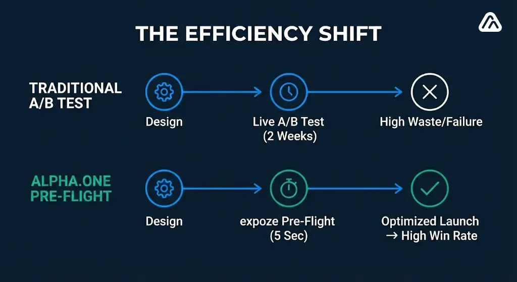 - The Problem: Traditional A/B testing is a "lagging indicator." You only find out a design failed after you've wasted budget and 14 days of traffic.